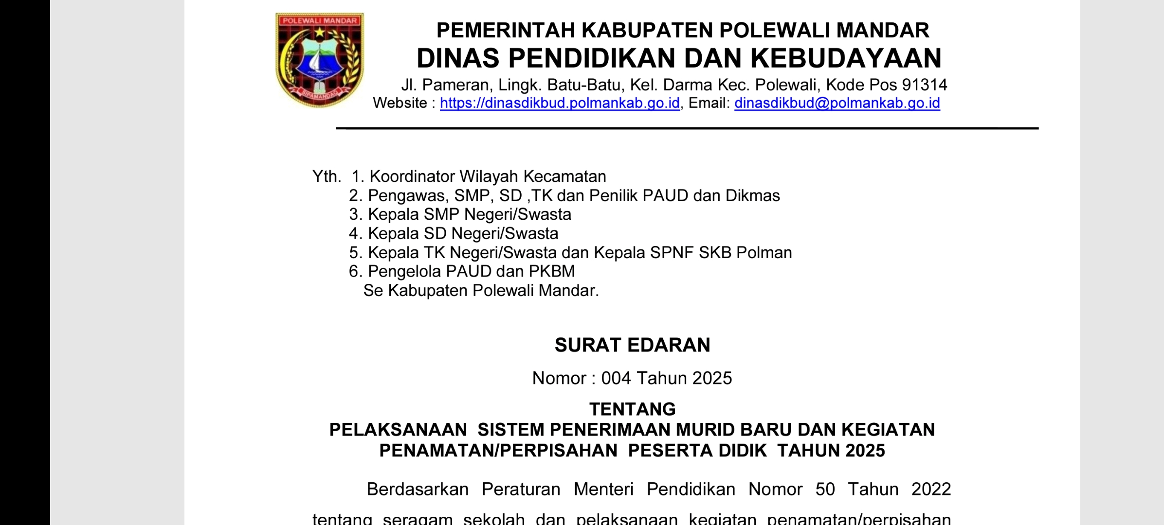 Polewali Mandar, 14 Mei 2025 – Dinas Pendidikan dan Kebudayaan Kabupaten Polewali Mandar menerbitkan Surat Edaran Nomor 004 Tahun 2025 terkait pelaksanaan sistem penerimaan murid baru serta kegiatan penamatan/perpisahan peserta didik Tahun Pelajaran 2024/2025. Edaran ini menegaskan larangan praktik komersialisasi dalam kegiatan sekolah serta menekankan nilai-nilai kebersamaan dalam acara perpisahan siswa. Dalam surat edaran yang ditandatangani oleh Kepala Dinas Pendidikan dan Kebudayaan, A. ...